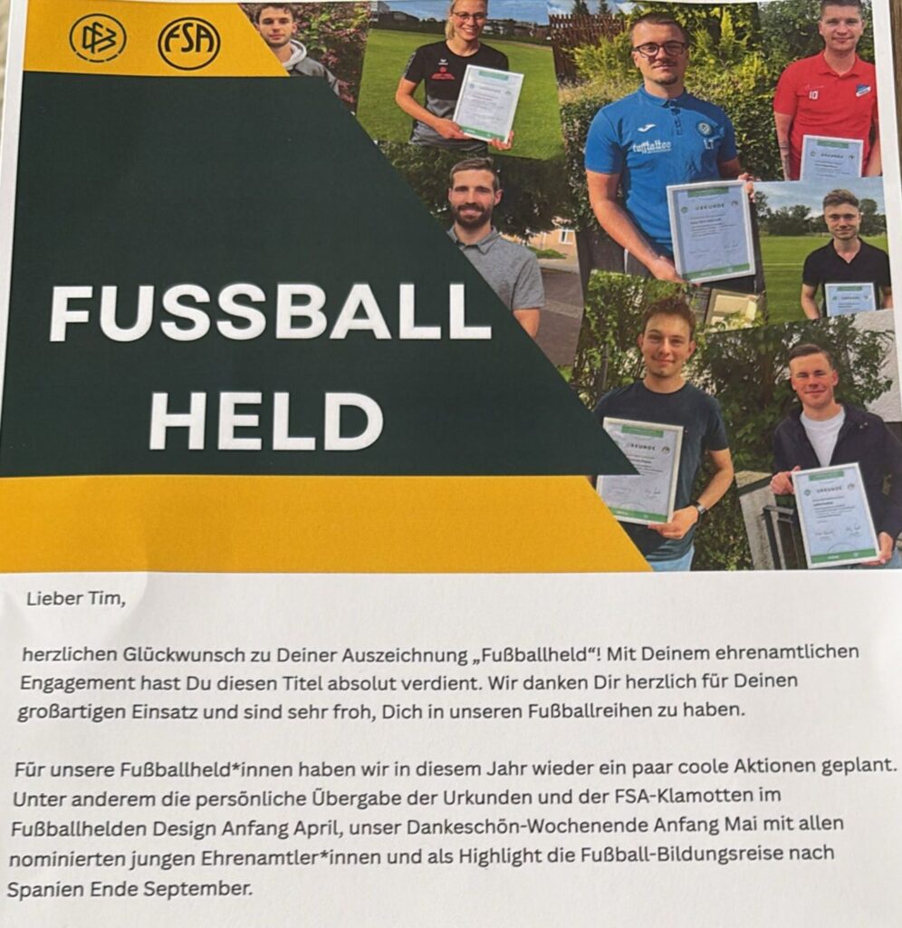 Über eine besondere Auszeichnung des Fußballverband Sachsen-Anhalt und des Deutschen Fußballbundes durfte sich am heutigen Tag der Trainer unserer U13 Tim Müller freuen, der für sein großes ehrenamtliches Engagement (u.a. als Trainer und Schiedsrichter) als Highlight der Auszeichnung über eine Reise nach Barcelona im Herbst diesen Jahres freuen kann.